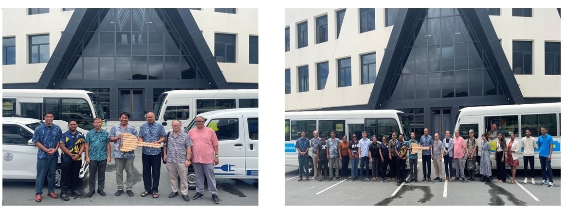 On September 29, 2025, Deputy Chief of Mission Mr. ONO Shunsuke attended the handover ceremony of two new buses and EVs for the Project for Establishing an Eco-Friendly Transportation System. The event also showcased the achievements of the eco-friendly transportation project to date and presented an overview of the Master Plan for Palau’s public transport.