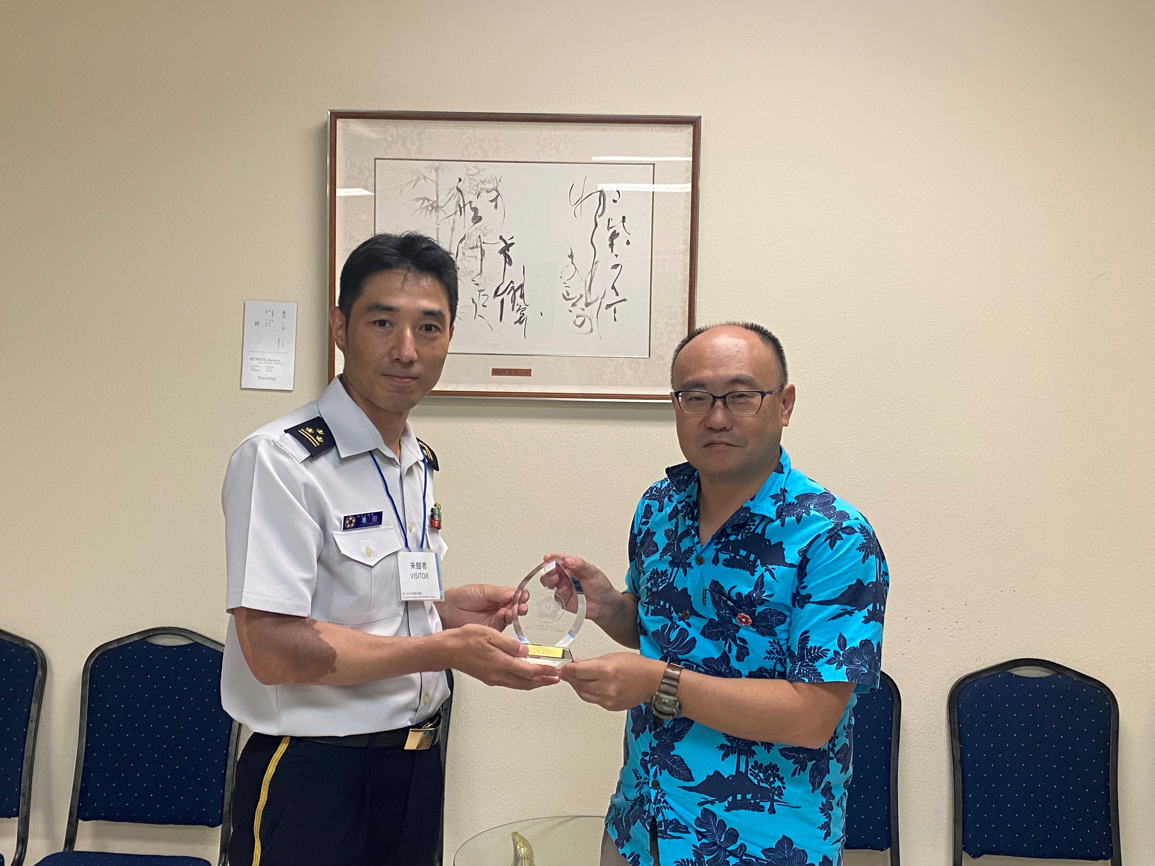 On September 30th, Colonel KAMEDA from the Japan Ground Self Defense Force met with the Deputy Chief of Mission, Mr. ONO Shunsuke. Colonel Kameda represented the JSDF participants to the Pacific Partnership 25. During their 10days mission in Palau, JSDF participants conducted medical activities at Palau National Hospital, and repaired the Community Health Center in Peleliu.