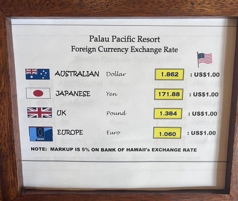 ホテル:パラオ・パシフィック・リゾート及びパラオ・ロイヤル・リゾート(宿泊客のみフロントデスクで両替可能)