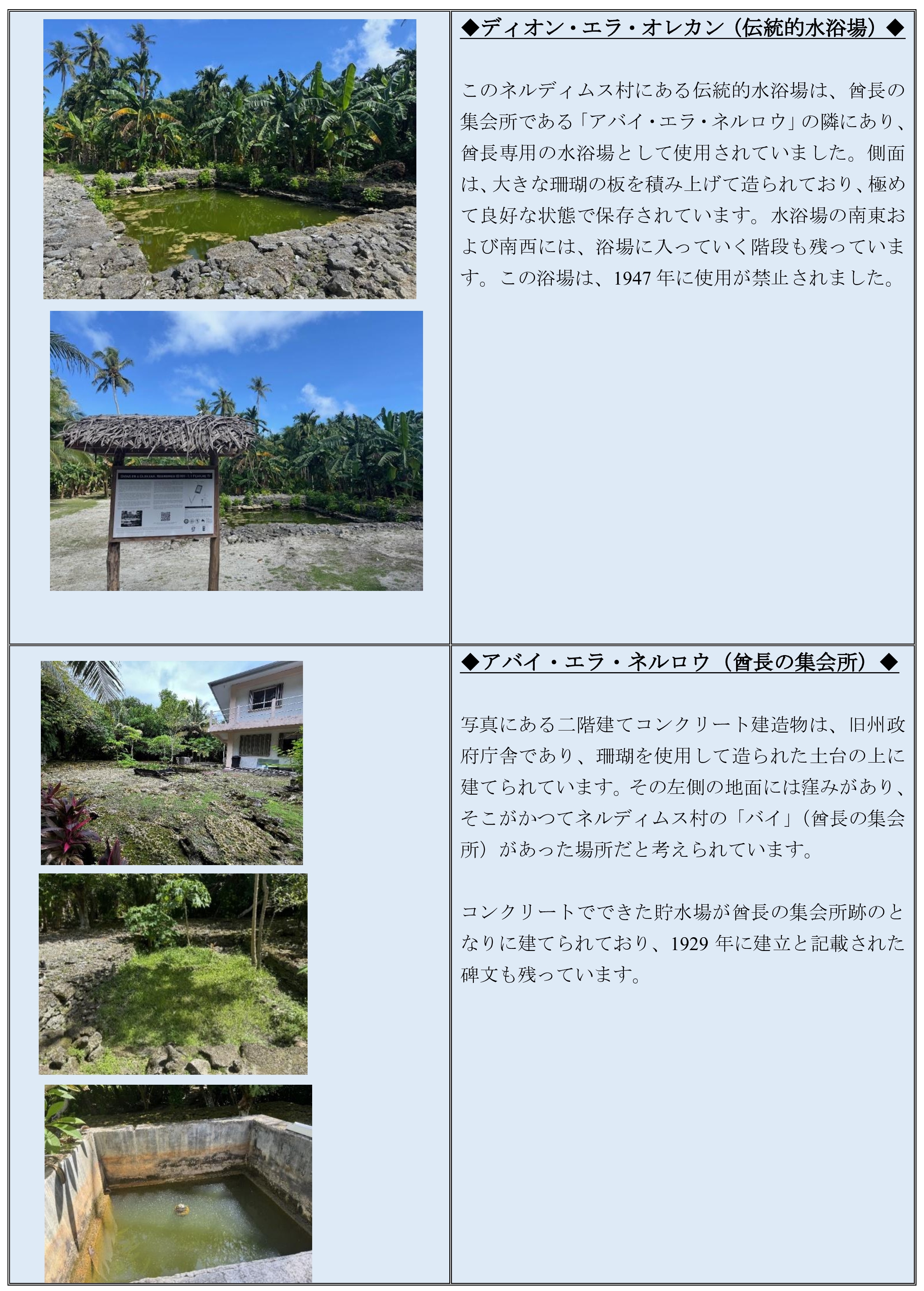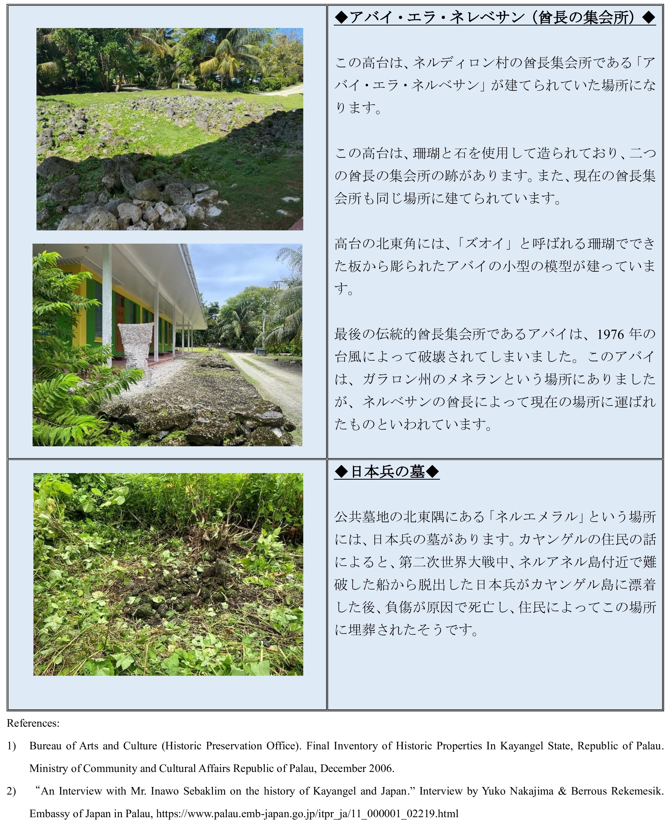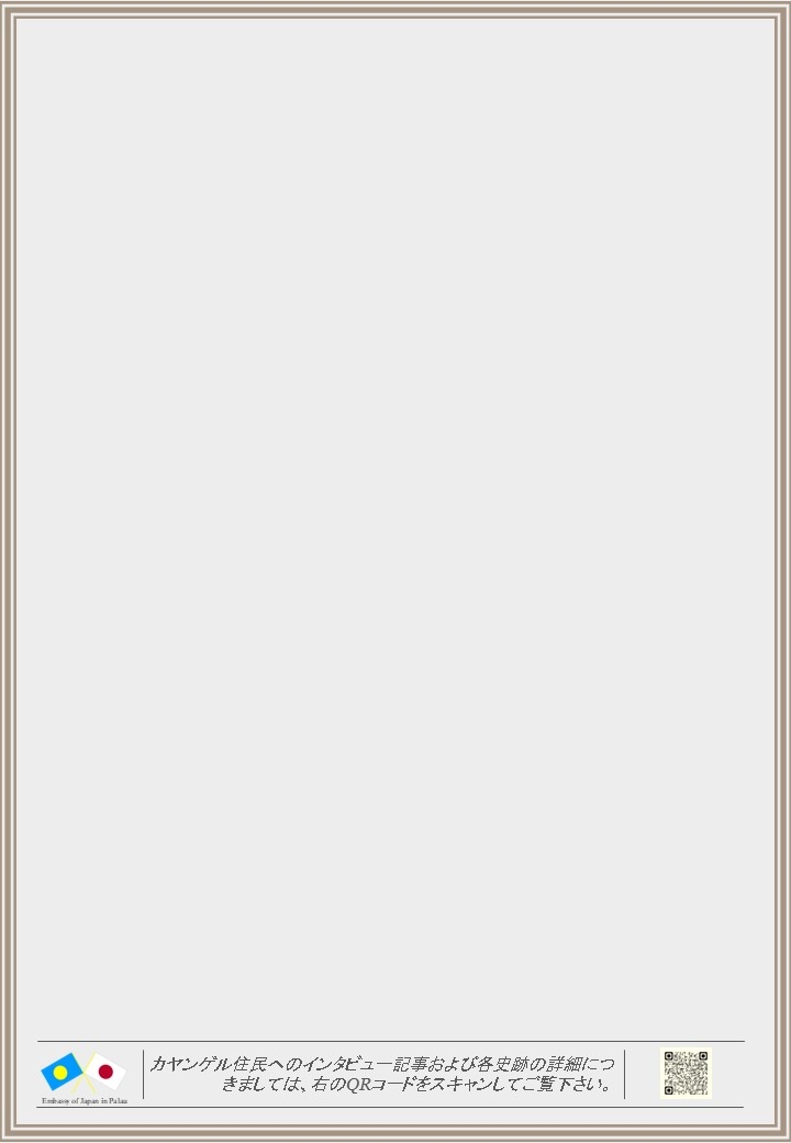 イナオ氏に若い頃のカヤンゲルでの生活について尋ねたところ、「当時は島が活気に満ちていて、20軒ほどの家があり、皆が親族共に大家族で一つ屋根の下で暮らしていた。」とお話してくださいました。現在では、当時の家の多くは廃屋となり、住民のほとんどがパラオ本島や海外に移住して暮らしています。
