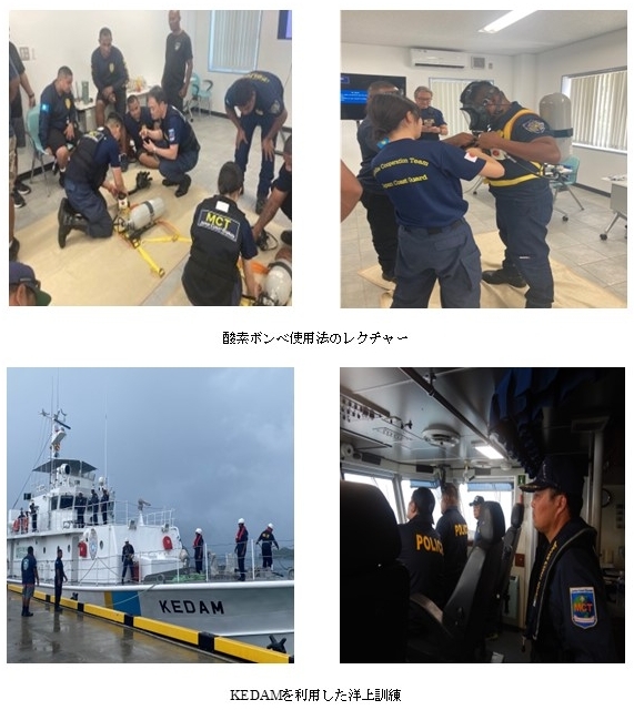 訓練前半は、遭難救助時に使用する酸素ボンベの使用方法の等のレクチャー及びデモンストレーションを実施し、海上警察職員の基礎能力向上を図りました。訓練後半は実際に沖に出て、日本財団が供与した巡視船・KEDAM(ケダム)を使用したシナリオ訓練を実施しました。海上保安庁MCTによるパラオでの訓練は、今回で7回目となり、パラオ海上警察と良好な協力関係を築いています。