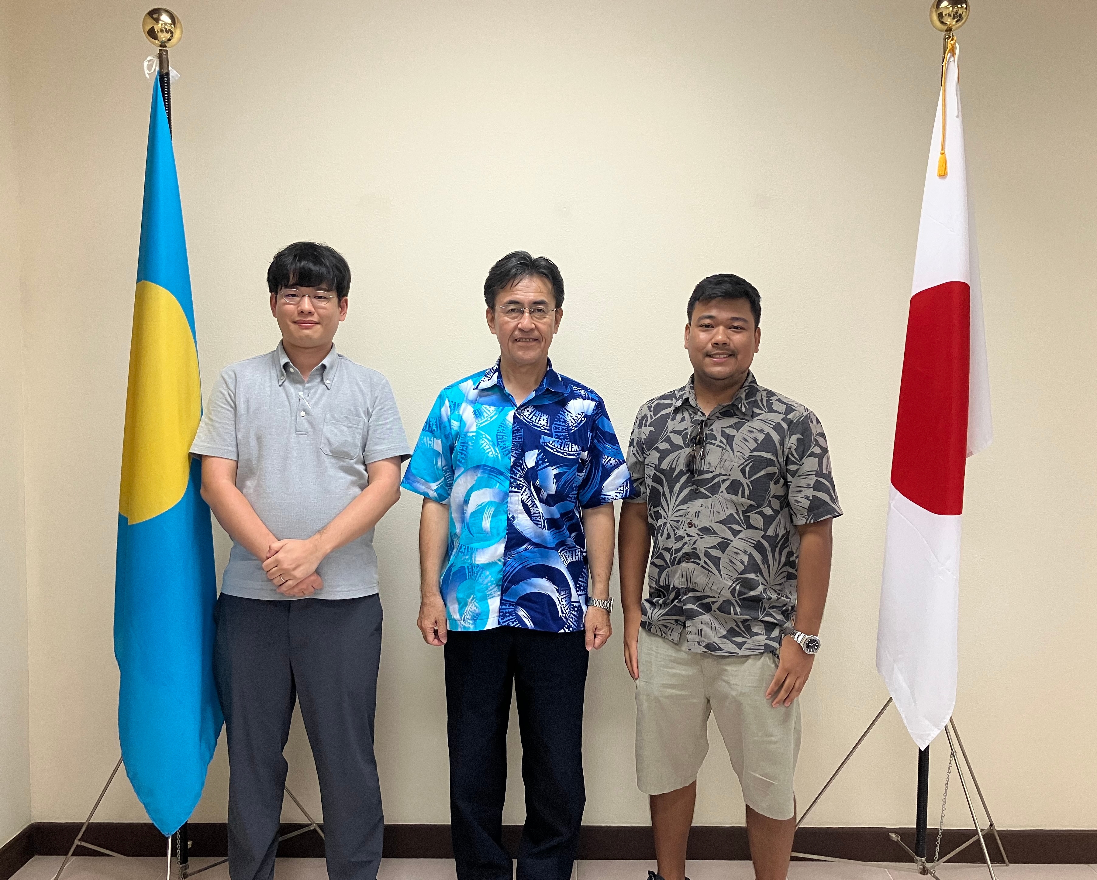 神洋交易の大使館訪問 令和8年2月11日 2026年2月10日、農林水産省が推進する日本の農林水産物・食品輸出プロジェクトGFPの会員で、太平洋各国へ日本等の商品の輸出を行っている神洋交易社の高田太郎氏が、スランゲル・アンド・サンズ社関係者とともに笠原謙一大使を訪問し、パラオにおける健康的な日本産食品等の普及について意見交換をしました。