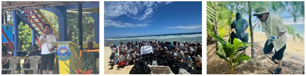 笠原大使によるペリリュー州におけるビーチクリーンアップ活動への参加 令和8年3月25日 2026年3月22日、笠原健一大使は、ウィップス大統領、ロバーツペリリュー州知事、角南笹川平和財団理事長、及び田中美奈子日・パラオ親善大使他とともに、ペリリュー州においてビーチクリーンアップ活動に参加しました。本活動には、パラオ政府関係者、外交団他、ペリリュー州の地域住民の皆様も参加しました。