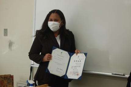 奨学金プログラムの一環として、ベロウスさんは大阪日本語教育センターで1年間の日本語コースを受講しました。最初に模擬試験を受け、その結果に応じて習熟度別にクラスが決められました。彼女の日本語レベルは、初心者レベル(日本語能力試験(JLPT)N5相当)から始まり、留学終了時にはN3レベルまで上達しました。ベロウスさんは、「リスニングとライティングの学習は比較的容易でしたが、スピーキングが難しかったです。」と語りました。また、大阪日本語教育センターでの1年間は、寮で生活しており、さまざまな国の学生と友達になることができたそうです。京都コンピュータ学院での2年間は、京都のアパートで一人暮らし生活も経験しました。あるとき、大阪ロータリークラブの方から炊飯器と約5kgの米が寄付されました。ベロウスさんはとても感謝しており、頂いた炊飯器を日本滞在の3年間、ずっと使い続けたそうです。