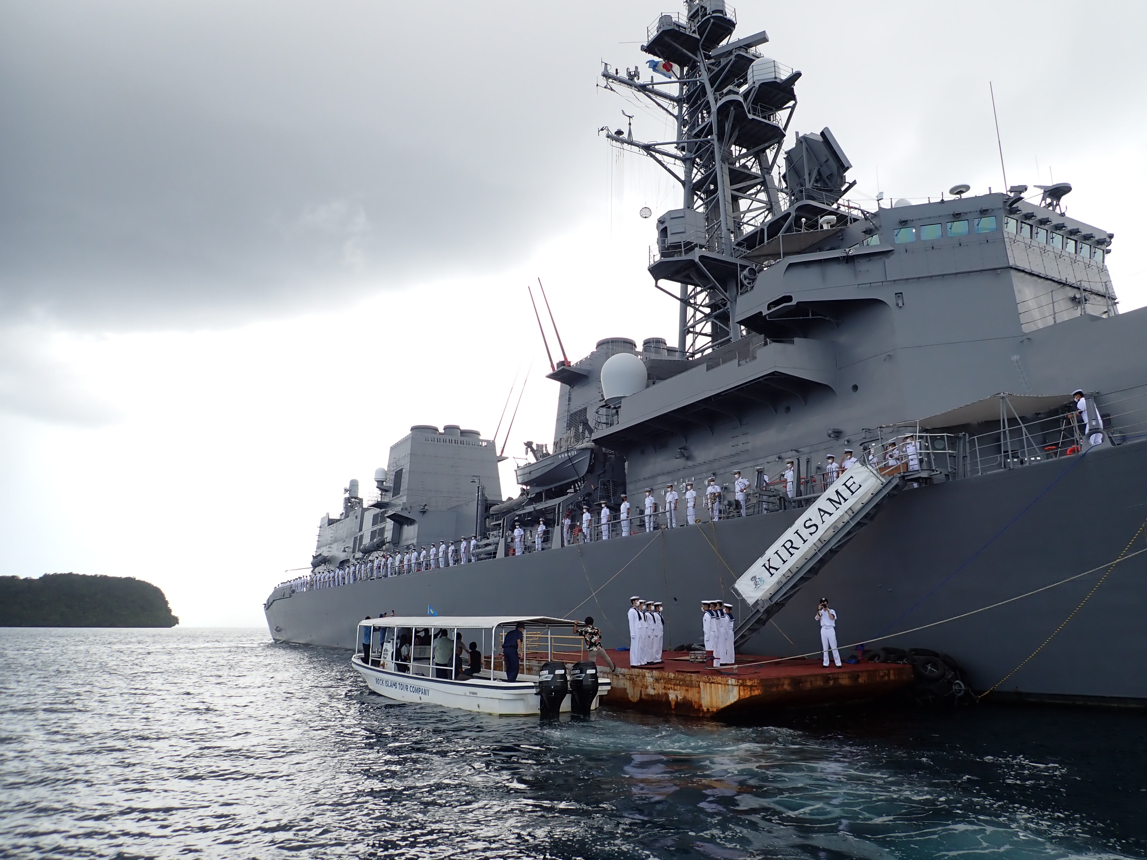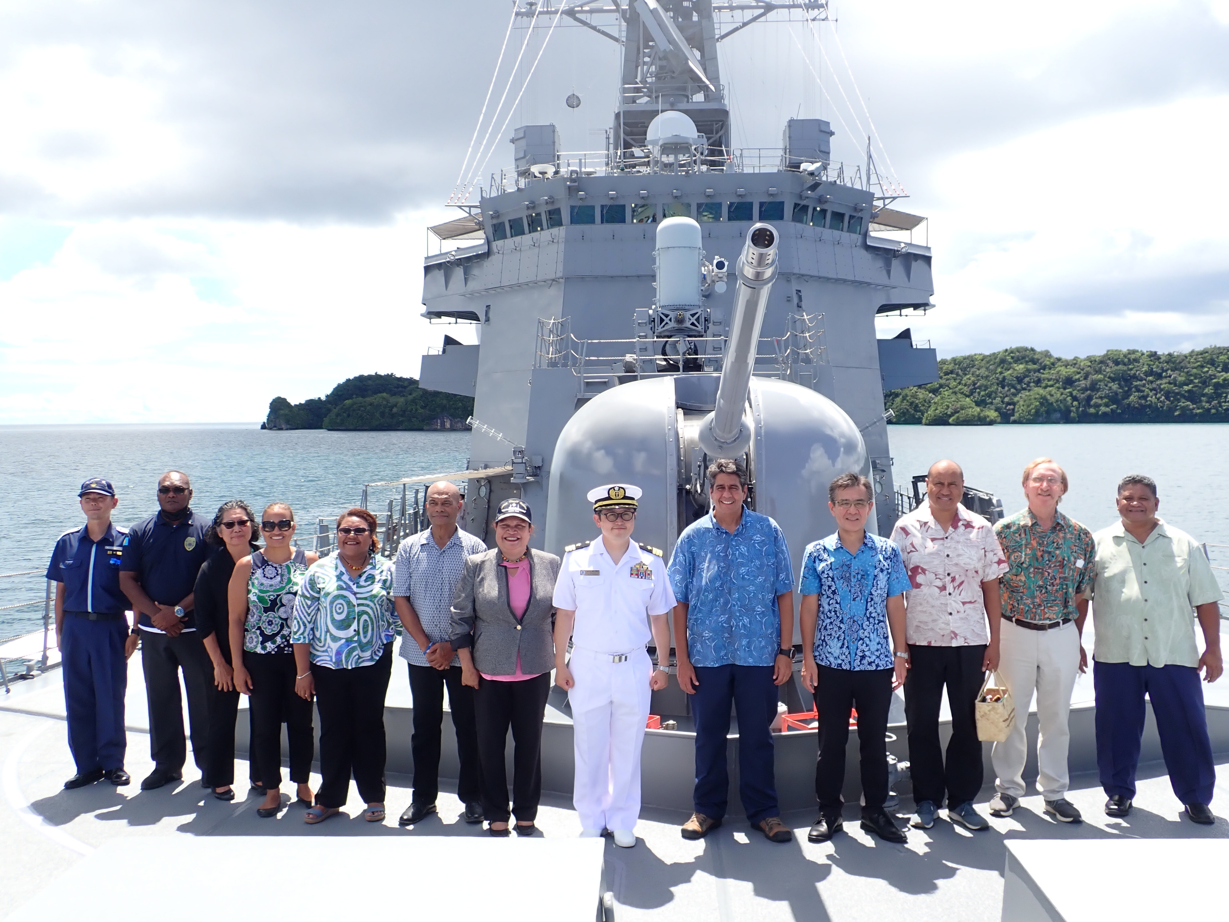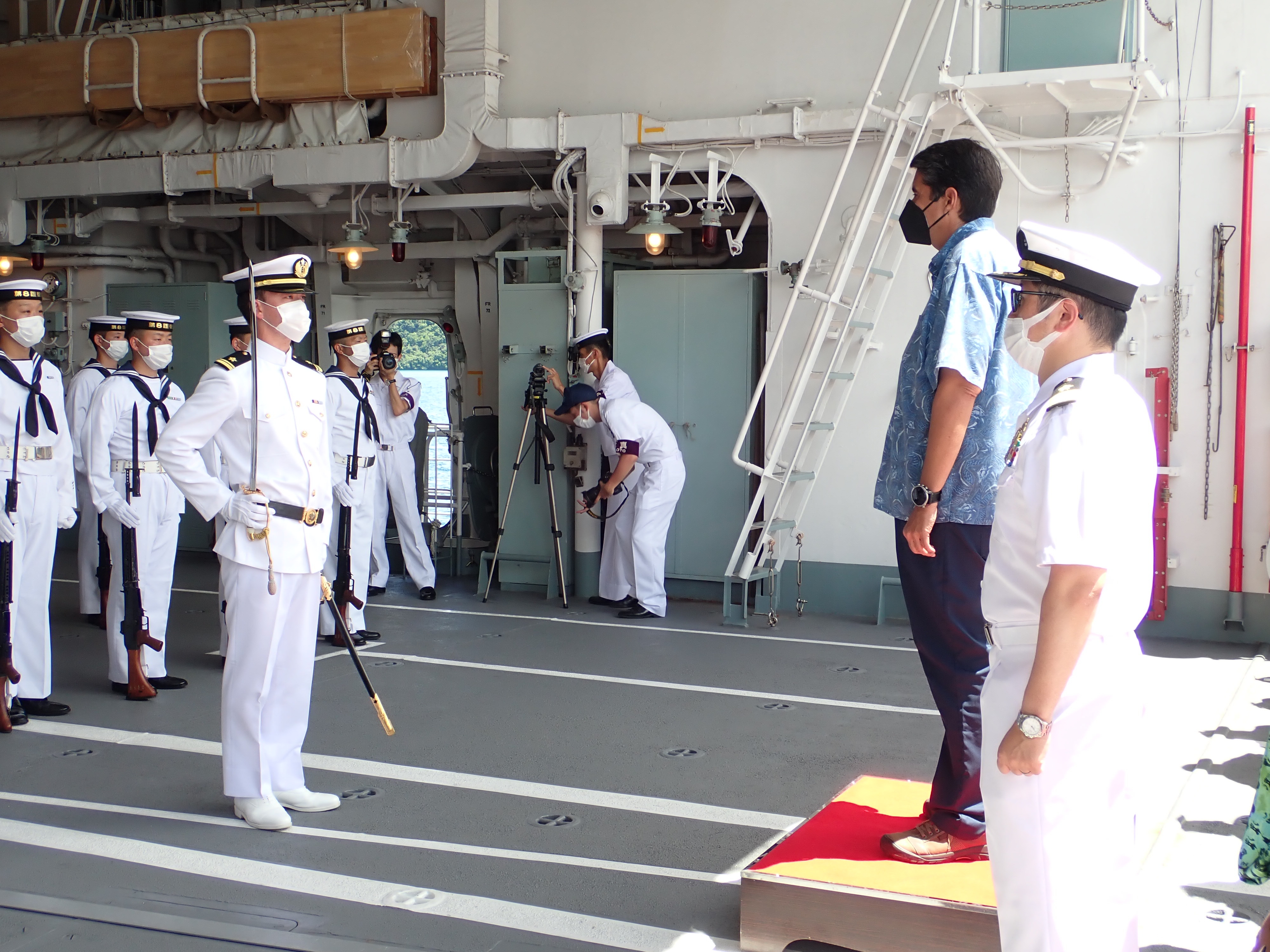 On July 18, President Surangel Whipps, Jr. boarded the Japan Maritime Self-Defense Force (JMSDF) destroyer KIRISAME at the invitation of Commander SAKATA Atsushi, Commanding Officer of KIRISAME to participate in a Salute of Honor of Guards, a tour of the ship, and a courtesy ceremony. This event was also attended by Ambassador KARASAWA Akira, Vice President and Minister of Justice Uduch Sengebau-Senior, Minister of State Gustav Aitaro, Minister of Public Infrastructure and Industries Charles Obichang, Minister of Human Resources, Culture, Tourism and Development Ngiraibelas Tmetuchl, Minister of Education Dale Jenkins, other government officials and local media.